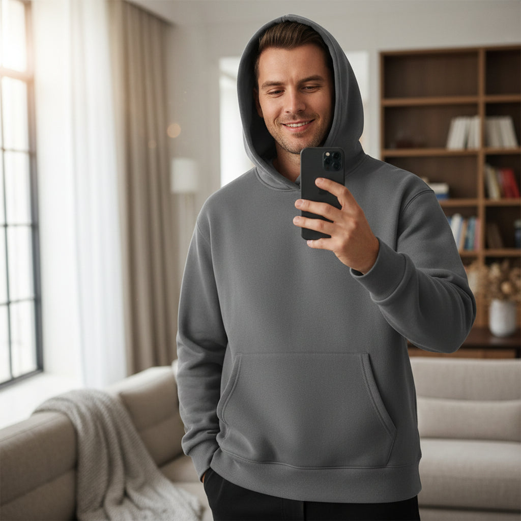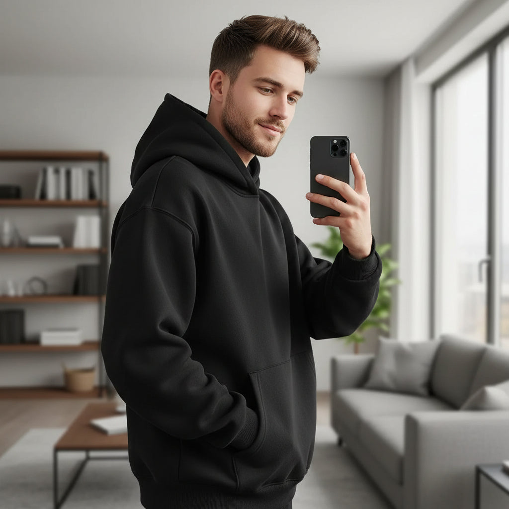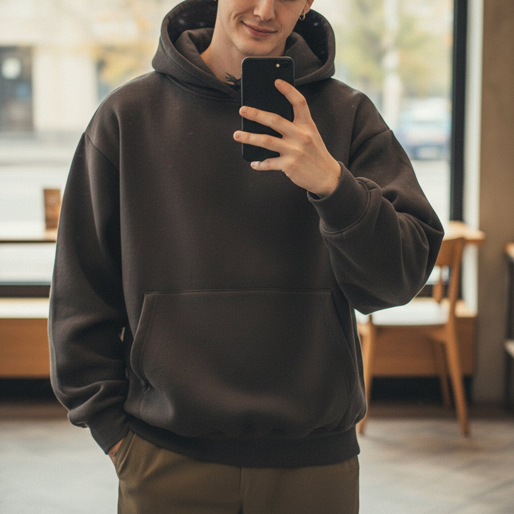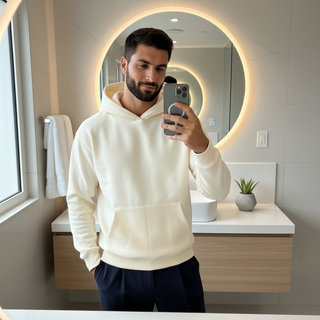 Nos hoodies sont confectionnés dans une matière dense et structurée, offrant une tenue nette, une chaleur maîtrisée et une sensation immédiatement premium au porté.